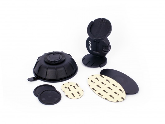 В комплекте поставки есть все необходимые для крепления аксессуары. Компактная присоска предназначена для лобового стекла. Стикеры крепят держатель на любой пластмассовой, стеклянной или металлической плоскости.