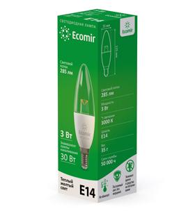Светодиодная лампа Ecomir E14 3W эквивалентна лампе накаливания мощностью 30 Вт. Колба прозрачная, имеет форму пламени свечи. Потребляемая мощность – 3 Вт, цветовая температура – 3000 К (это желтый свет). Световой поток — 285 лм. Напряжение — 220 В.