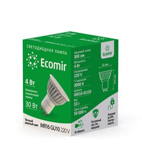 Светодиодная лампа Ecomir GU10 4W эквивалентна галогеновой лампе мощностью 35 Вт с цоколем MR16. Потребляемая мощность – всего 4 Вт, цветовая температура – 3000 К (это желтый свет). Световой поток — 300 лм. Напряжение — 220 В. Матовый рассеиватель. Угол освещения > 90°.