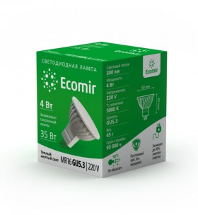 Светодиодная лампа Ecomir GU5.3 4W эквивалентна галогеновой лампе мощностью 35 Вт с цоколем MR16. Потребляемая мощность – всего 4 Вт, цветовая температура – 3000 К (это желтый свет). Световой поток — 300 лм. Напряжение — 220 В. Матовый рассеиватель. Угол освещения > 90°.