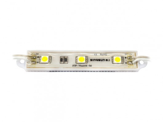 Линейный светодиодный модуль PL 5050-3 IP65 3240Lm — это 3 диода SMD 5050 и резисторы с рабочим напряжением 12V, которые находятся в пластиковом корпусе. Яркость 1 диода составляет 54Lm, а всей упаковки — 3240Lm, что дает вам очень яркое и насыщенное свечение. Корпус залит двухкомпонентным компаундом. Поэтому вы можете использовать светодиодный модуль led в условиях  повышенной влажности и резкого перепада внешней температуры от  -30 до +50 градусов.