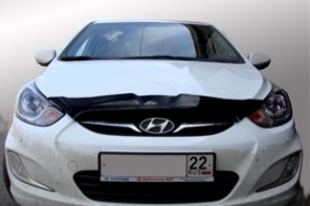 Короткий дефлектор капота для Hyundai Solaris — это щиток из орг.стекла темного цвета, который крепится на переднюю часть капота. Благодаря тому, что дефлектор разработан специально для Hyundai Solaris от 2010 г.в., устанавливается он легко и быстро, при этом сверлить кузов вам не нужно. По форме же накладка полностью повторяет контуры капота. Данная модель прочна и долговечна: она надежно крепится, не боится коррозии, экстремальных температур и серьезных перегрузок.