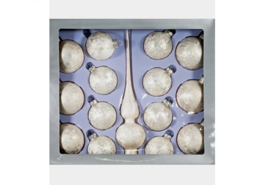 В набор PeneriGifts входит верхушка для елки и 14 шаров диаметром 6 и 7 см. Этого более чем достаточно, чтобы целиком нарядить даже самую высокую домашнюю ель. И вам не придется долго подбирать елочные украшения — в наборе есть все, что нужно. Даже не обязательно добавлять мишуру — любая елка и без нее будет выглядеть элегантно и самодостаточно. Матовые серебристые шарики из стекла смотрятся добротно, нарядно и гармонично. А легкие узоры из "инея" придают им особый шарм.