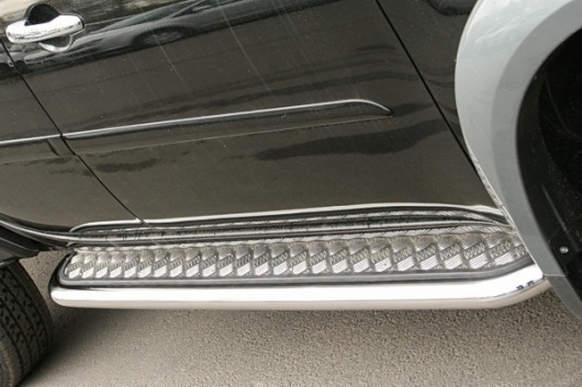 Пороги на Mitsubishi L200 – это боковые подножки из нержавеющей стали диаметром 60 мм, которые позволяют более комфортно входить и выходить из салона автомобиля. Подножки Mitsubishi L200 очень прочные, надежные и долговечные: они не боятся коррозии, сколов и царапин и выдерживают большие нагрузки.