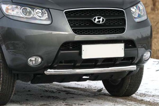 Защита переднего бампера труба предназначена для автомобилей Hyundai Santa Fe от 2006 г.в. Вам не придется подгонять защиту под размеры бампера вашего авто. И с монтажом проблем не возникнет: установка защиты переднего бампера производится в штатные отверстия, а значит, необходимость сверлить кузов отпадает.