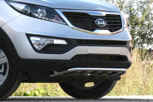 Нижняя защита переднего бампера с элементами из профиля (акула) предназначена для автомобилей Kia Sportage от 2010 г.в. Вам не придется подгонять защиту под размеры бампера вашего авто. И с монтажом проблем не возникнет: установка защиты переднего бампера производится в штатные отверстия, а значит, необходимость сверлить кузов отпадает.