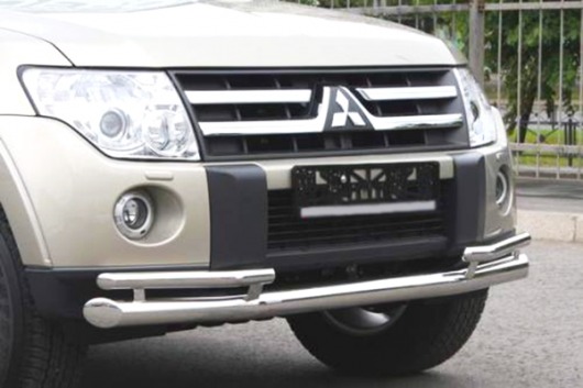 Защита переднего бампера для Mitsubishi Pajero IV – это двойная труба на бампер из нержавеющей стали диаметром 76/42 мм.