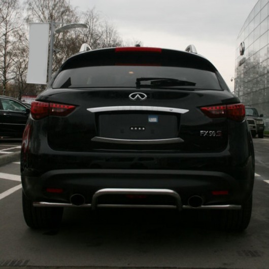Труба на задний бампер Infiniti FX 35/50 защищает задний бампер автомобиля от различных механических повреждений при столкновениях на дороге и неудачных парковках. А кроме этого, защита заднего бампера для Инфинити Фх — это дополнительная деталь тюнинга.