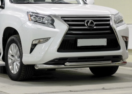 Защита переднего бампера труба предназначена для автомобилей Lexus GX460 от 2013 г.в. Вам не придется подгонять защиту под размеры бампера вашего авто. И с монтажом проблем не возникнет: установка защиты переднего бампера производится в штатные отверстия, а значит, необходимость сверлить кузов отпадает.