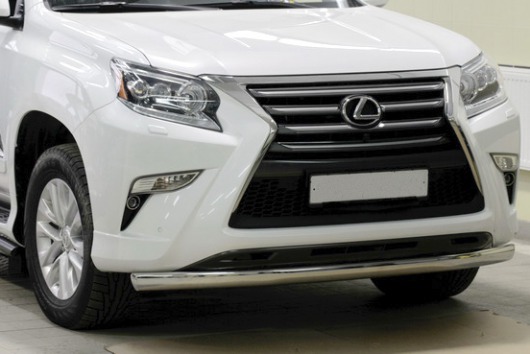 Защита переднего бампера труба предназначена для автомобилей Lexus GX460 от 2013 г.в. Вам не придется подгонять защиту под размеры бампера вашего авто. И с монтажом проблем не возникнет: установка защиты переднего бампера производится в штатные отверстия, а значит, необходимость сверлить кузов отпадает.