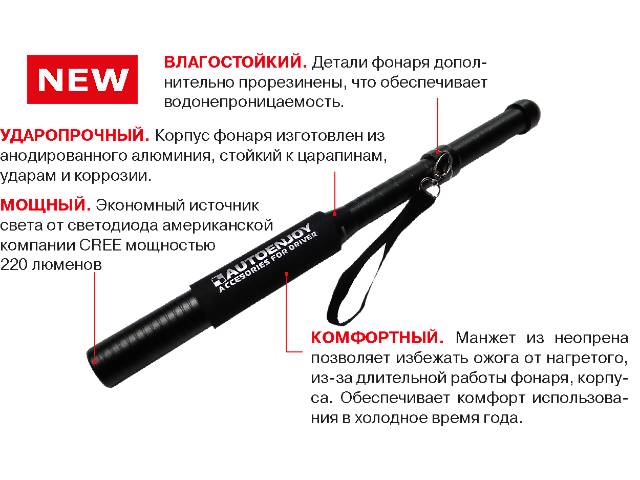 Удобная рукоятка. Манжеты на рукоятке фонаря-биты изготовлены из неопрена, благодаря чему вам очень удобно и приятно держать его в руках при любой уличной температуре — и в мороз, и в жару.