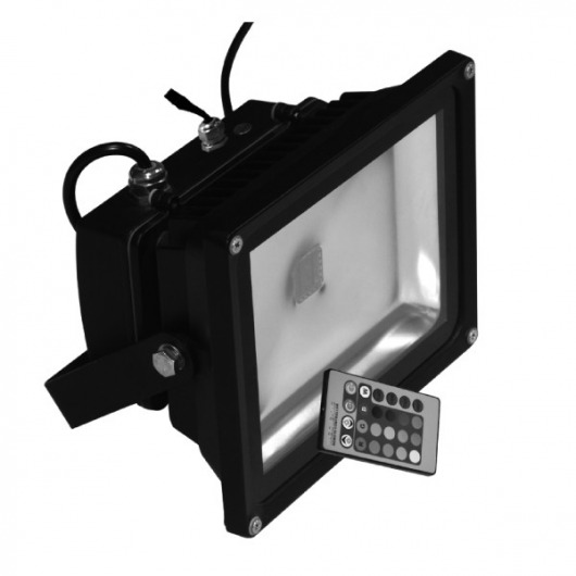 Led rgb прожектор имеет в комплекте пульт ДУ с литиевой батарейкой, с помощью которого можно регулировать яркость свечения и режимы (постоянное свечение, плавная смена цветов, стробоскоп). Радиус действия — 6 метров. Это облегчает пользование прожектором в местах с ограниченным или затрудненным обслуживанием.