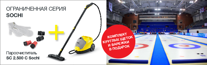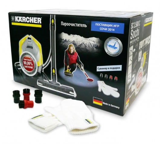 Karcher SC 2.500 C Sochi — это парогенератор, который был выпущен специально к Олимпийским играм в Сочи (2014 г.), поэтому дизайн упаковки выполнен в стиле данных спортивных соревнований. Также в комплектацию пароочистителя Керхер SC 2.500 C Sochi включены подарки – комплект круглых щеток и варежки с символикой Керхер.