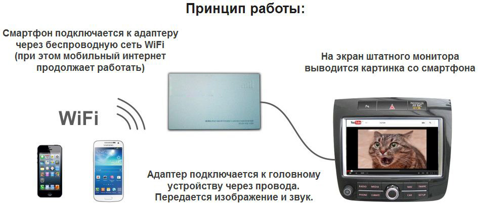 MIRACAST. Функция переносит картинки с Самсунг смартфонов на Android последнего поколения. Вы просто переводите адаптер в режим MIRACAST, выбираете в телефоне функцию AllShareCast, в поиске находите адаптер и подключаетесь к нему. После этого картинки с вашего смартфорна будут отображаться на мониторе машины.