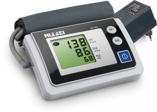 Без батареек автоматический тонометр на плечо DS-500 весит очень мало - около 260 грамм. Питание прибора осуществляется при помощи 4-х элементов типа АА. В комплект также входит блок питания на 220 В.