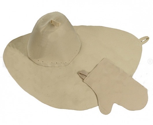 В этот набор для бани входит шапка, рукавичка и коврик. Они являются спутниками каждого любителя побаловать свое тело горячим паром.
