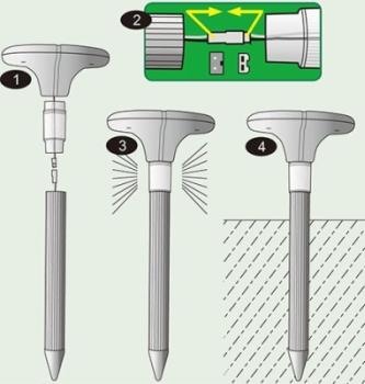 • верхняя часть устройства должна быть над поверхностью почвы на высоте не ниже отметки на трубке отпугивателя.