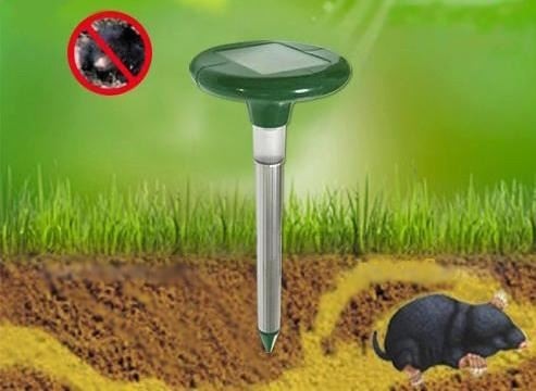 Специальная форма прибора позволяет легко и просто устанавливать его в почву. Встроенный генератор через излучатель посылает сигналы определенной частоты, которые заставляют кротов и грызунов в панике покидать обжитые места в радиусе до 700 м2. Это может занять до нескольких недель при постоянном применении отпугивателя.