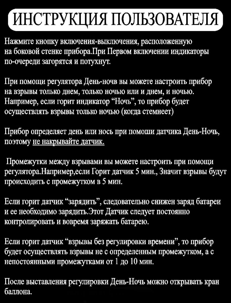Для повышения эффективности рекомендуем использовать несколько устройств по периметру с разными интервалами срабатывания, периодически меняя места расположения отпугивателей. Избегайте использование крайних положений регулятора; применение небольших баллонов с газом (5-10 л) делают отпугиватель более мобильным.