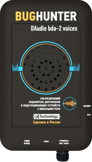 Ультразвуковой сигнал не слышим для человеческого уха, поэтому никак не мешает процессу переговоров. А громкость акустической помехи легко регулируется. В результате действия глушителя BugHunter DAudio bda-2 Voices любые подслушивающие устройства с микрофонами улавливают и записывают лишь неразборчивый шум.