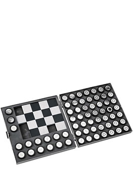 Игровое поле (размер 147*147 мм). Шашки и поле расположены в сером спонже в металлическом футляре