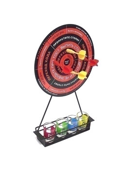 Девиз: Целься! Стреляй! Отдыхай! Описание: Настольный игровой набор представляет собой металлическую мишень с держателем для рюмок, набор магнитных дротиков и четыре стеклянные стопки, маркированные разными рисунками. Разлейте по рюмкам живительную влагу, распределите стопки между игроками, и кидайте дротики в мишень, которая сама подскажет правила игры. Весёлый игровой набор поможет разнообразить коллективные вечеринки. Набор упакован в фирменную картонную коробку.