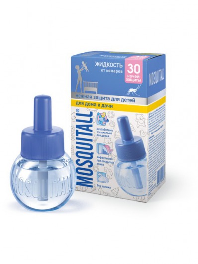 Жидкость для фумигатора от комаров MOSQUITALL "Нежная защита для детей. Для дома и дачи" рассчитана на 30 ночей защиты вашего ребенка от комаров. Вне зависимости от того, будь то городская квартира или загородный дом, фумигатор гарантированно уничтожает всех комаров внутри помещения площадью в 15 квадратных метров уже через 20-30 минут даже при открытых окнах! Можете быть уверенными, что с включенным фумигатором на протяжении всей ночи ни один комар не потревожит сон вашего малыша. Инсектицид в жидкости содержится в концентрации, безопасной для детей младшего возраста. И кроме того, никаких посторонних запахов!