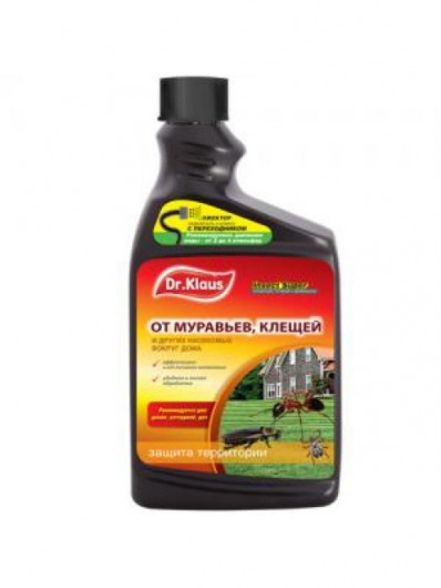 Dr. Klaus Insect Super — универсальное инсектицидное средство от муравьев, клещей и других насекомых. Средство разработано специально для территорий вокруг загородных домов и избавляет от любых ползающих насекомых и их личинок, в том числе от иксодовых клещей. При обработке газонов и декоративных растений эффективно борется с целым рядом садовых вредителей (тля, майский жук, совки, цикадки, трипсы, белокрылки, луговой мотылек, листоеды, долгоносик, пилильщики, мешочница, златогузка, горностаевая моль и др.).