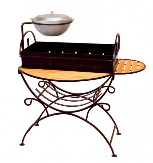 И это не единственные преимущества дачного кованого мангала МСК. Несмотря на изящность и компактность, его конструкция отличается особой прочностью. Стойка усилена элементами ручной ковки, а ящик мангала изготовлен из цельного листа жаростойкой стали толщиной 2 мм на гидравлическом прессе. Такая жаровня выдерживает высокие температурные нагрузки в течение долгого времени и не деформируется. А спереди и сбоку жаровни расположились 2 удобных деревянных столика (один из них съемный), которые можно использовать как подставки для посуды или вместо разделочных досок. В комплекте с мангалом вы также получите казан на 5 литров. В нем можно готовить плов или разогревать уже готовый шашлык.