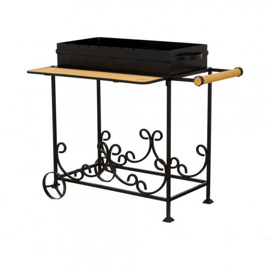 И это не единственные преимущества дачного кованого мангала МС-3. Несмотря на изящность и компактность, его конструкция отличается особой прочностью. Стойка усилена элементами ручной ковки, а ящик мангала изготовлен из цельного листа жаростойкой стали толщиной 2 мм на гидравлическом прессе. Такая жаровня выдерживает высокие температурные нагрузки в течение долгого времени и не деформируется. А спереди жаровни расположился удобный деревянный столик, который можно использовать как подставку для посуды или вместо разделочной доски.