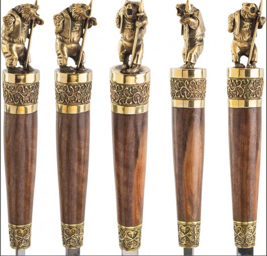 • Особого внимания заслуживает ореховая рукоятка с литым бронзовым фигурным наконечником. Каждая фигурка — это автроская ювелирная работа. Ручка крупная, массивная, хорошо лежит в руке и при этом не перевешивает шампур.