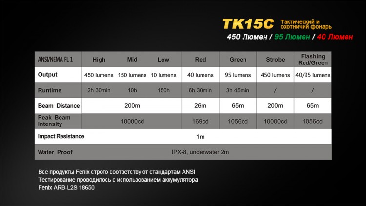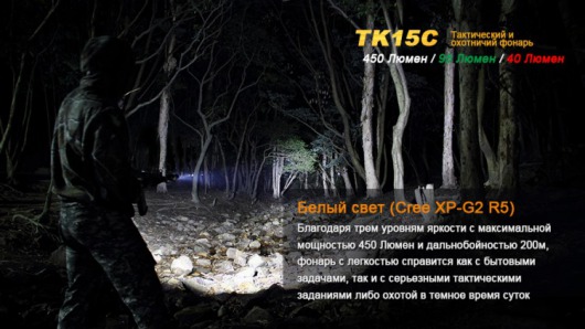В светодиодном фонаре Fenix TK15C размещены сразу три светодиода. Центральный из них Cree XP-G2 R5 светит белым с яркостью 450 люмен и в состоянии работать в течение 50 000 ч. Диод белого света отвечает за работу фонаря в режимах: High (450 люмен) - Mid (150 люмен) - Low (10 люмен) - Strobe (450 люмен). По бокам от этого диода расположены два цветных - Philips LUXEON Z. С их помощью фонарь работает в режимах красного и зеленого света. Характеристики этих режимов следующие: Red (40) - Green (95) - Red/Green (40/95).