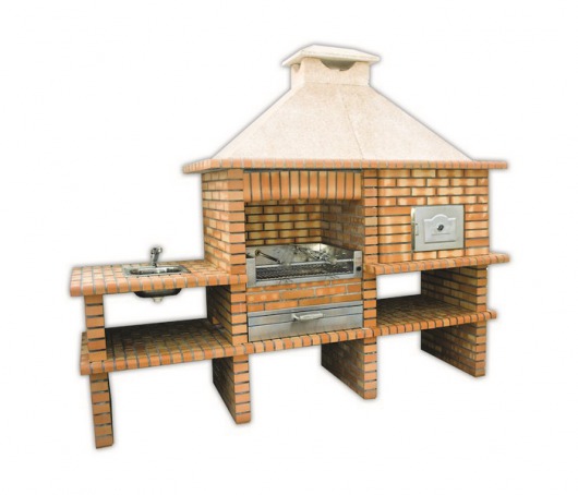 Садовая печь-барбекю из натурального кирпича Рим REF 117 — отличный выбор для большой семьи. Эта модель комплектуется стальным мангалом и русской печкой, так что вы сможете готовить 2 блюда одновременно: одно на решетке, шампурах или вертеле, другое в горшочках. Плюс к этому, печка снабжена кирпичной столешницей со встроенной мойкой, так что перед вами — полноценная садовая кухня.
