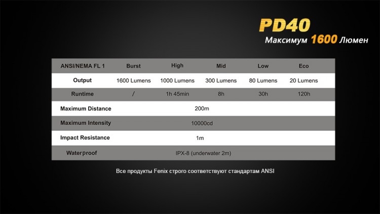 Модель Fenix PD40 наделена широкой универсальностью применения. Этот фонарь будет одинаково рационально использовать в туристических походах, во время охоты и рыбалки, отдыха в кемпинге и во многих других ситуациях. Внутри небольшого по размерам корпуса этого осветительного прибора находится мощность и долговечность фонаря профессионального уровня.