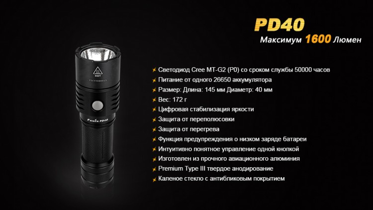 Корпус осветительного прибора выполнен из прочного и легкого алюминиевого сплава, который также используется в авиапромышленности. Для дополнительной надежности на его поверхность нанесено анодированное покрытие Premium Type III. Передняя линза модели PD40 сделана из закаленного стекла с просветляющим напылением. Для функционирования фонаря понадобится всего 1 литий-ионный аккумулятор типоразмера 26650, к аккумулятору подойдет зарядное устройство TrustFire TR-006.