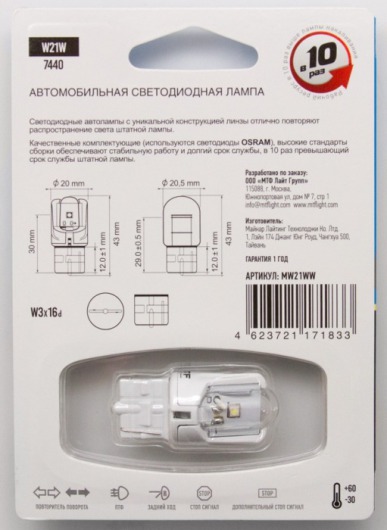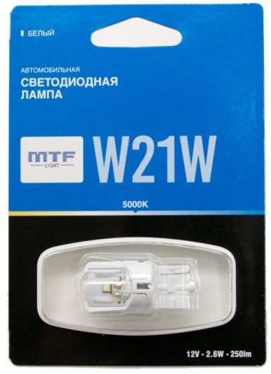 Светодиодная лампа MTF Light W21W 2.6W с уникальной конструкцией линзы отлично повторяет распространение света штатной лампы. Цвет свечения автолампы: белый.