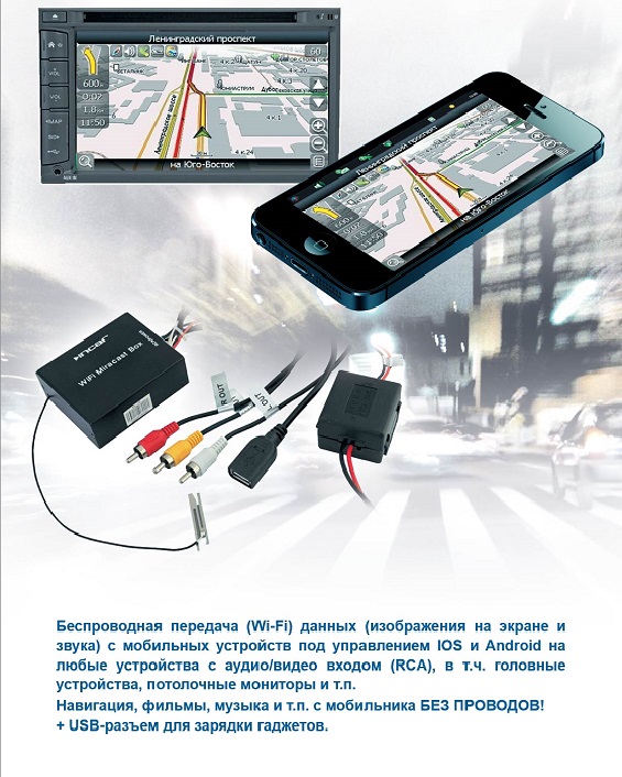 Предназначен для передачи данных по Wi-Fi с мобильных устройств на операционных системах IOS, Android на головные устройства автомобиля. Возможно использование навигации, видео, интернета, игр, видео, музыки, находящихся на внешнем устройстве.