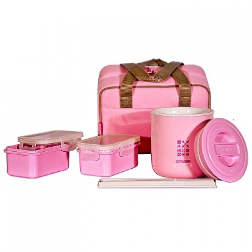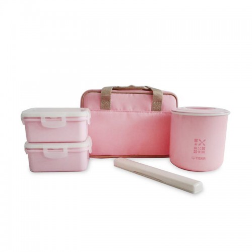 Наборы для обедов с термосумкой. В комплекте: цилиндрическая, герметично закрывающаяся пластиковая емкость, которая вставляется в термоконтейнер из нержавеющей стали, а также 2 пластиковых контейнера и палочками в пенале, и все это помещается в удобной компактной термосумке.