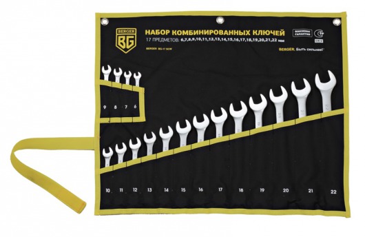 BERGER BG-17SCW — это набор комбинированных гаечных ключей, состоящий из 17 инструментов – от 6 до 22 мм. Комбинированные ключи BERGER BG-17SCW хранятся в удобном чехле, в котором все ключи расположены строго по размеру.