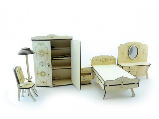Очаровательная мебель с затейливыми цветочками на гравировке придает уют  кукольному домику.  Также данный набор кукольной спальни можно использовать и отдельно. В любом случае, такая спальня для кукол из дерева – мечта любой девочки!